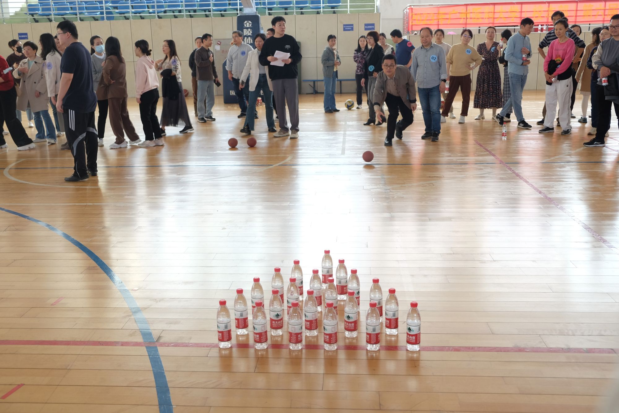 全体职工按工会小组分成10组参赛,比赛共设有活力“篮”不住,“鼓”动精彩和新式保龄球三项趣味运动。比赛成员依次投篮,互相鼓劲喝彩;六人合作拉绳,合作击球,默契大PK;三人接力保龄球,力争第一!运动场上老师们欢声笑语,气氛热烈,全身心地投入到比赛当中。